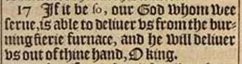 17 If it be so, our God whom wee serue, is able to deliuer vs from the burning fierie furnace, and he will deliuer vs out of thine hand, O king.
