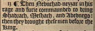 13 ¶ Then Nebuchad-nezzar in his rage and furie commaunded to bring Shadrach, Meshach, and Abednego: then they brought these men before the King.