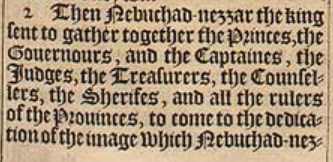 2 Then Nebuchad-nezzar the king sent to gather together the Princes, the Gouernours, and the Captaines, the Iudges, the Treasurers, the Counsellers, the Sherifes, and all the rulers of the Prouinces, to come to the dedication of the image which Nebuchad-nezzar the King had set vp.
