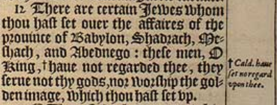 12 There are certain Iewes whom thou hast set ouer the affaires of the prouince of Babylon, Shadrach, Meshach, and Abednego: these men, O King, +haue not regarded thee, they serue not thy gods, nor worship the golden image, which thou hast set vp. [ +Cald. haue set no regard vpon thee. ]