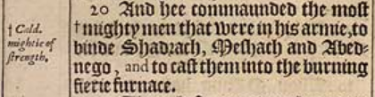 20 And hee commaunded the most +mighty men that were in his armie, to binde Shadrach, Meshach and Abednego, and to cast them into the burning fierie furnace. [ +Cald. mightie of strength. ]