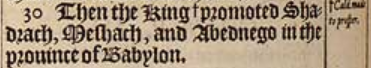 30 Then the King +promoted Shadrach, Meshach, and Abednego in the prouince of Babylon. [ Cald. made to prosper. ]