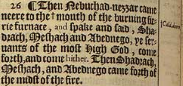 26 ¶ Then Nebuchad-nezzar came neere to the + mouth of the burning fierie furnace, and spake and said, Shadrach, Meshach and Abednego, ye seruants of the most High God, come forth, and come hither. Then Shadrach, Meshach, and Abednego came forth of the midst of the fire. [ + Cald. doore. ]