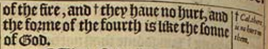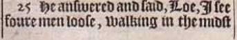 25 He answered and said, Loe, I see foure men loose, walking in the midst of the fire, and +they haue no hurt, and the forme of the fourth is like the sonne of God. [ + Cal. there is no hurt in them. ]