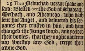 28 Then Nebuchad-nezzar spake and said; Blessed bee the God of Shadrach, Meshach, and Abednego, who hath sent his Angel, and deliuered his seruants that trusted in him, and haue changed the Kings word, and yeelded their bodies, that they might not serue nor worship any God, except their owne God.