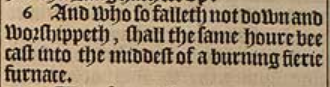6 And who so falleth not down and worshippeth, shall the same houre bee cast into the middest of a burning fierie furnace.