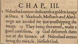 1 Nebukadnezar weiht ein goldenes Bildnis in dura ein. 8 Schadrach, Mesach und Abed-Nego werden beschuldigt, dem Bildnis nicht zu huldigen. 13 Sie machen, bedroht, ein gutes Geständnis. 19 Gott erlöst sie aus dem Schmelzofen . 26 Nebukadnezar sieht das Wunder, preist Gott.
