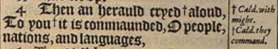 4 Then an herauld cryed+aloud, To you+it is commaunded, O people, nations, and languages, [ +Cald. with might. , + Cald. they command. ]