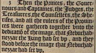 3 Then the Princes, the Gouernours and Captaines, the Iudges, the Treasurers, the Counsellers, the Sherifes, and all the rulers of the Prouinces were gathered together vnto the dedicatiō of the image, that Nebuchadnezzar the King had set vp, and they stood before the image that Nebuchadnezzar had set vp.