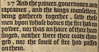 27 And the princes, gouernours, and captaines, and the kings counsellers, being gathered together, saw these men, vpon whose bodies the fire had no power, nor was an haire of their head singed, neither were their coats changed, nor the smell of fire had passed on them.