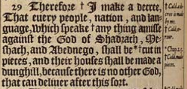 29 Therefore +I make a decree, That euery people, nation, and language, which speake +any thing amisse against the God of Shadrach, Meshach, and Abednego, shall be*+ cut in pieces, and their houses shall be made a dunghill, because there is no other God, that can deliuer after this sort. [ +Cald. a decree is made by me. , +Cald. errour. , *+Chap.2.5. , Cald. made pieces.]