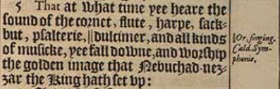 5 That at what time yee heare the sound of the cornet, flute, harpe, sackbut, psalterie, || dulcimer, and all kinds of musicke, yee fall downe, and worship the golden image that Nebuchad-nezzar the King hath set vp: [ || Or, singing. Cald. Symphonie.]