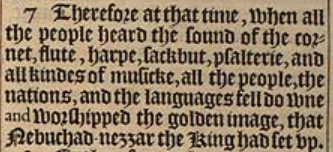 7 Therefore at that time, when all the people heard the sound of the cornet, flute, harpe, sackbut, psalterie, and all kindes of musicke, all the people, the nations, and the languages fell downe and worshipped the golden image, that Nebuchad-nezzar the King had set vp.