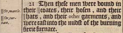 21 Then these men were bound in their || coates, their hosen, and their ||hats, and their other garments, and were cast into the midst of the burning fierie furnace. [ || Or, mantle. , || Or, turbant. ]