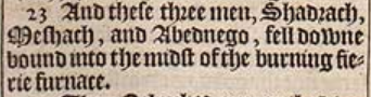23 And these three men, Shadrach, Meshach, and Abednego, fell downe bound into the midst of the burning fierie furnace.