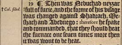 19 ¶ Then was Nebuchad-nezzar full of furie, and the forme of his visage was changed against Shadrach, Meshach and Abednego: therefore he spake and commanded, that they should heat the furnace one seuen times more then it was wont to be heat. [ Cal. filled. ]