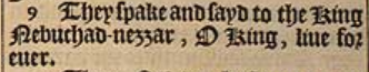 9 They spake and sayd to the King Nebuchad-nezzar, O King, liue for euer.