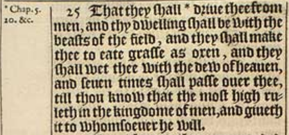 25 That they shall *driue thee from men, and thy dwelling shall be with the beasts of the field, and they shall make thee to eate grasse as oxen, and they shall wet thee with the dew of heauen, and seuen times shall passe ouer thee, till thou know that the most high ruleth in the kingdome of men, and giueth it to whomsoeuer he will. [ * Chap.5. 20. &c. ]