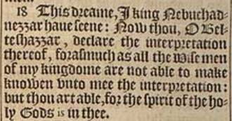 18 This dreame, I king Nebuchadnezzar haue seene: Now thou, O Belteshazzar, declare the interpretation thereof, forasmuch as all the Wise men of my kingdome are not able to make knowen vnto mee the interpretation: but thou art able, for the spirit of the holy Gods is in thee.