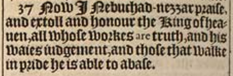 37 Now I Nebuchad-nezzar praise, and extoll and honour the King of heauen, all whose workes are truth, and his waies iudgement, and those that walke in pride he is able to abase.