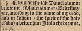8 ¶ But at the last Daniel came in before me, (whose name was Belteshazzar, according to the name of my God, and in whom is the spirit of the holy Gods) & before him I told the dreame, saying,