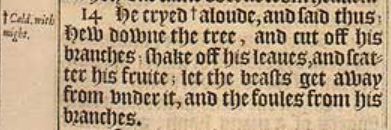 14 He cryed +aloude, and said thus; Hew downe the tree, and cut off his branches; shake off his leaues, and scatter his fruite; let the beasts get away from vnder it, and the foules from his branches. [ +Cald. with might. ]
