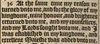 36 At the same time my reason returned vnto me, and for the glory of my kingdome, mine honour, and brightnes returned vnto me, and my counsellers, and my Lords sought vnto me, and I was established in my kingdome, and excellent Maiestie was added vnto me.