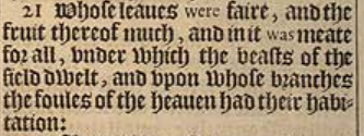 21 Whose leaues were faire, and the fruit thereof much, and in it was meate for all, vnder which the beasts of the field dwelt, and vpon whose branches the foules of the heauen had their habitation: