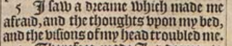 5 I saw a dreame which made me afraid, and the thoughts vpon my bed, and the visions of my head troubled me.