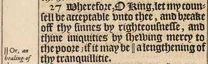 27 Wherefore, O King, let my counsell be acceptable vnto thee, and breake off thy sinnes by righteousnesse, and thine iniquities by shewing mercy to the poore; if it may be || a lengthening of thy tranquillitie. [ || Or, an healing of thine errour. ]