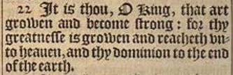 22 It is thou, O King, that art growen and become strong: for thy greatnesse is growen and reacheth vnto heauen, and thy dominion to the end of the earth.