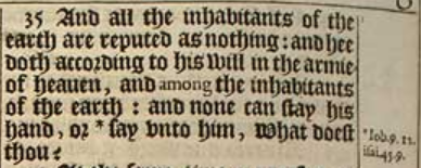 35 And all the inhabitants of the earth are reputed as nothing: and hee doth according to his will in the armie of heauen, and among the inhabitants of the earth: and none can stay his hand, or *say vnto him, What doest thou? [ * Iob.9.12. isai.45.9. ]