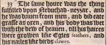 33 The same houre was the thing fulfilled vpon Nebuchad-nezzar, and he was driuen from men, and did eate grasse as oxen, and his body was wet with the dew of heauen, till his haires were growen like Egles feathers, and his nailes like birds clawes.