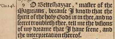 9 'Oh Beltsazar, *Meister der Magier, weil ich weiß, dass der Geist der heiligen Götter in dir ist und kein Geheimnis dich bekümmert, zeige mir die Vision meines Traums, den ich gesehen habe und die Interpretation davon.[*Daniel 1:48]