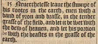 15 Neuerthelesse leaue the stumpe of his rootes in the earth, euen with a band of yron and brasse, in the tender grasse of the field, and let it be wet with the dew of heauen, and let his portion be with the beastes in the grasse of the earth.
