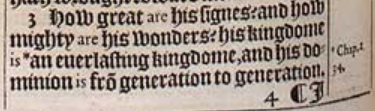 3 How great are his signes? and how mighty are his wonders? his kingdome is *an euerlasting kingdome, and his dominion is frō generation to generation. [ * Chap.2. 34. ]