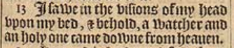 13 I sawe in the visions of my head vpon my bed, & behold, a watcher and an holy one came downe from heauen.
