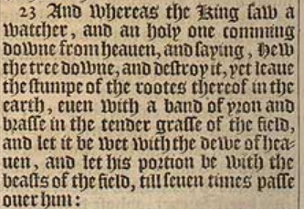 23 And whereas the King saw a watcher, and an holy one comming downe from heauen, and saying, Hew the tree downe, and destroy it, yet leaue the stumpe of the rootes thereof in the earth, euen with a band of yron and brasse in the tender grasse of the field, and let it be wet with the dewe of heauen, and let his portion be with the beasts of the field, till seuen times passe ouer him: