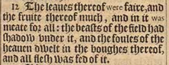 12 The leaues thereof were faire, and the fruite thereof much, and in it was meate for all: the beasts of the field had shadow vnder it, and the foules of the heauen dwelt in the boughes thereof, and all flesh was fed of it.
