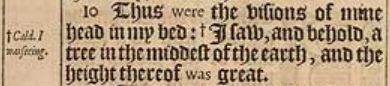 10 Thus were the visions of mine head in my bed: +I saw, and behold, a tree in the middest of the earth, and the height thereof was great. [ +Cald. I was seeing. ]