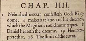 1 Nebukadnezar erkennt Gottes Königreich an, 4 macht Verbindung seiner Träume, welche die Magiere nicht interpretieren können. 8 Daniel hört den Traum. 19 Er interpretiert ihn. 28 Die Geschichte des Vorkommnisses.