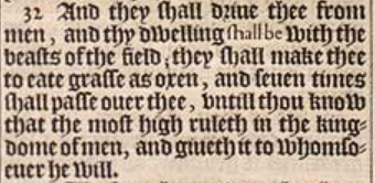 32 And they shall driue thee from men, and thy dwelling shall be with the beasts of the field; they shall make thee to eate grasse as oxen, and seuen times shall passe ouer thee, vntill thou know that the most high ruleth in the kingdome of men, and giueth it to whomsoeuer he will.