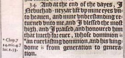 34 And at the end of the dayes, I Nebuchad-nezzar lift vp mine eyes vnto heauen, and mine vnderstanding returned vnto me, and I blessed the most high, and I praised, and honoured him that liueth for euer, whose dominion is *an euerlasting dominion, and his kingdome is from generation to generation.