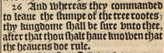26 And whereas they commanded to leaue the stumpe of the tree rootes; thy kingdome shall be sure vnto thee, after that thou shalt haue knowen that the heauens doe rule.
