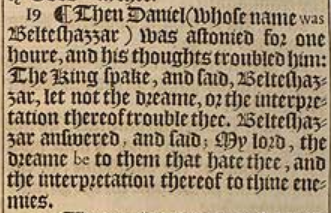 19 ¶ Then Daniel (whose name was Belteshazzar) was astonied for one houre, and his thoughts troubled him: The King spake, and said, Belteshazzar, let not the dreame, or the interpretation thereof trouble thee. Belteshazzar answered; and said; My lord, the dreame be to them that hate thee, and the interpretation thereof to thine enemies.