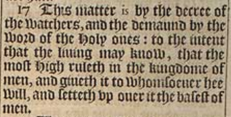 17 This matter is by the decree of the watchers, and the demaund by the word of the Holy ones: to the intent that the liuing may know, that the most High ruleth in the kingdome of men, and giueth it to whomsoeuer hee will, and setteth vp ouer it the basest of men.