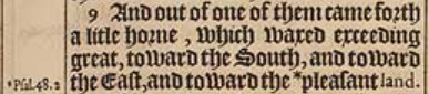 9 And out of one of them came forth a litle horne, which waxed exceeding great, toward the South, and toward the East, and toward the *pleasant land. [ * Psal.48. 2 ezek.20.6. ]