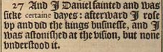 27 And I Daniel fainted and was sicke certaine dayes: afterward I rose vp and did the kings businesse, and I was astonished at the vision, but none vnderstood it.