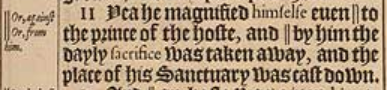 11 Yea he magnified himselfe euen || to the prince of the hoste, and || by him the dayly sacrifice was taken away, and the place of his Sanctuary was cast down. [ || Or, against , || Or, from him.]