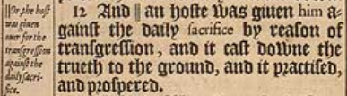 12 And || an hoste was giuen him against the daily sacrifice by reason of transgression, and it cast downe the trueth to the ground, and it practised, and prospered. [ || Or, the host was giuen ouer for the transgression against the daily sacrifice. ]